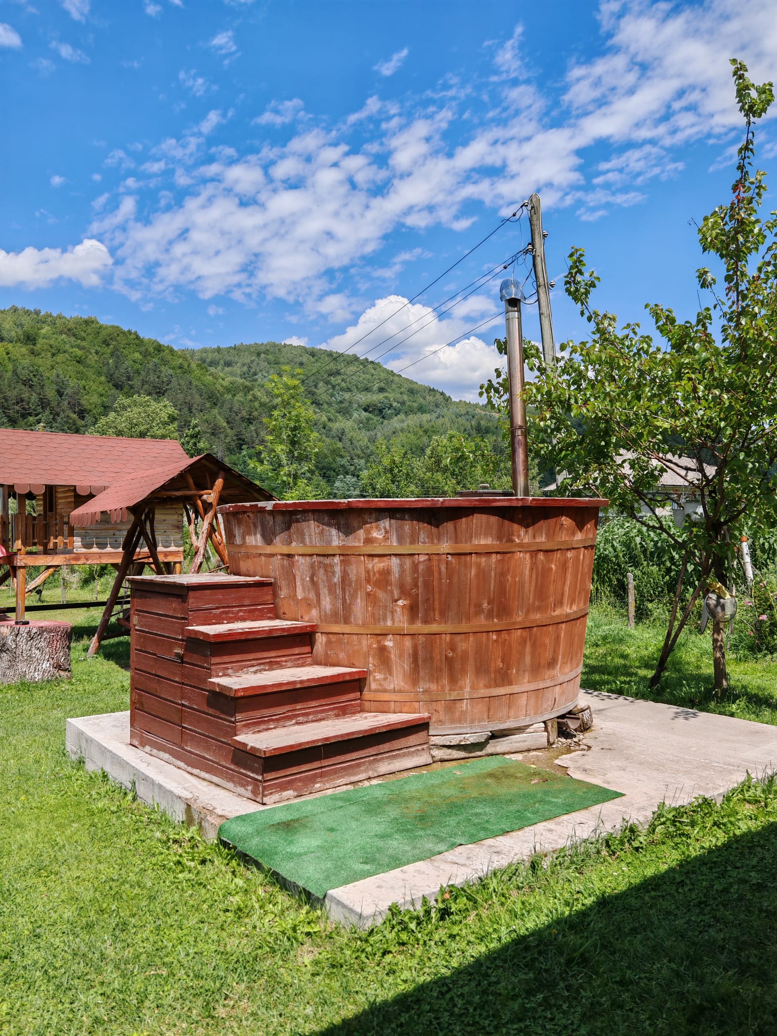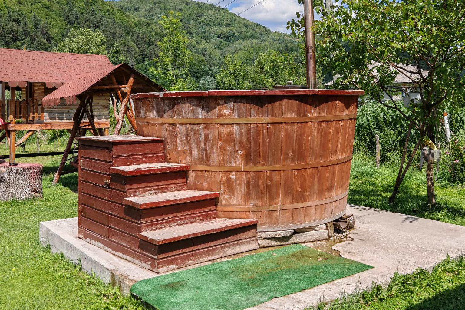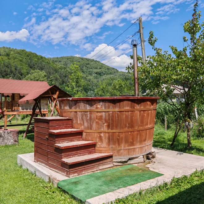 Ciubăr cu apă caldă, perfect pentru relaxare în aer liber, indiferent de anotimp. Ideal pentru momente de răsfăț și voie bună.