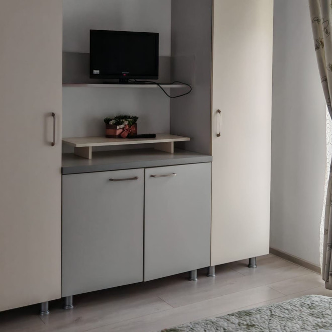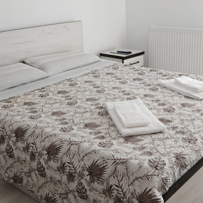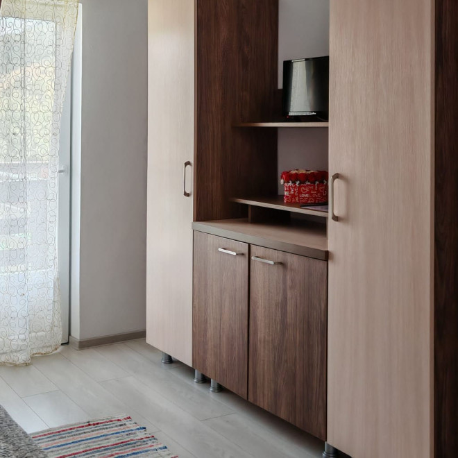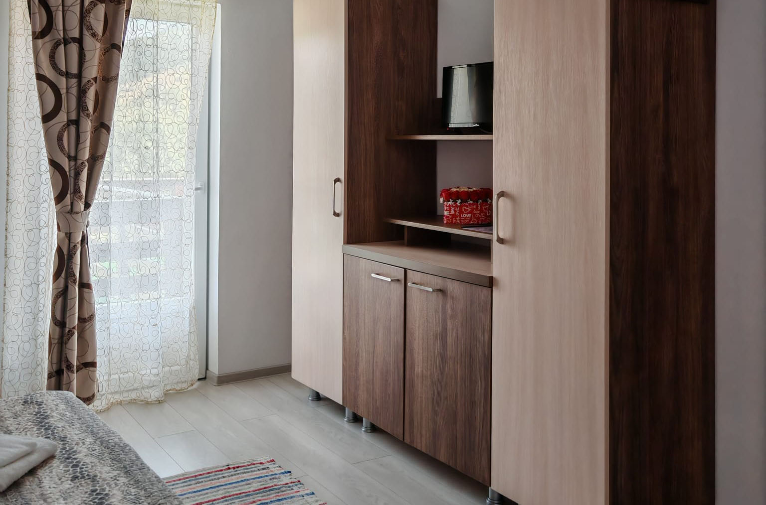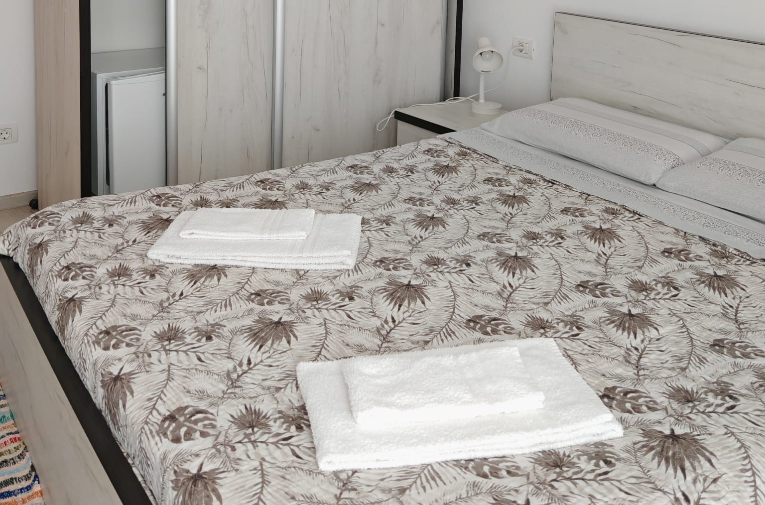 Această cameră spațioasă și luminoasă este ideală pentru cupluri sau turiști în căutarea confortului. Dispune de un pat matrimonial generos, baie proprie cu duș, frigider în cameră pentru păstrarea băuturilor sau gustărilor și acces la o terasă privată unde te poți relaxa în aer liber. Designul este simplu și plăcut, cu tot ce ai nevoie pentru un sejur liniștit.